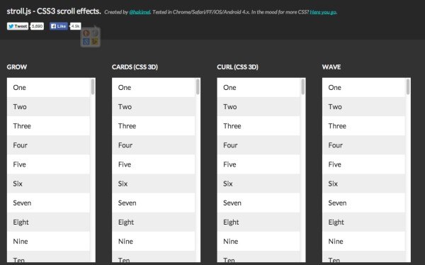 Stroll.js є CSS3 плагіном для додавання ефектів до прокрутки, який працює на всіх браузерах з підтримкою CSS 3D transforms.