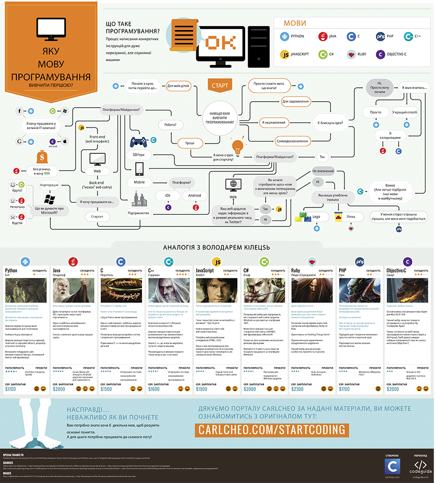 Ось проста і зрозуміла інфографіка, яка допоможе вам обрати першу мову програмування, оптимальний для вас варіант, в залежності від ваших цілей і інтересів. Деталі, такі як труднощі в навчанні, популярність, і середня заробітна плата присутні.