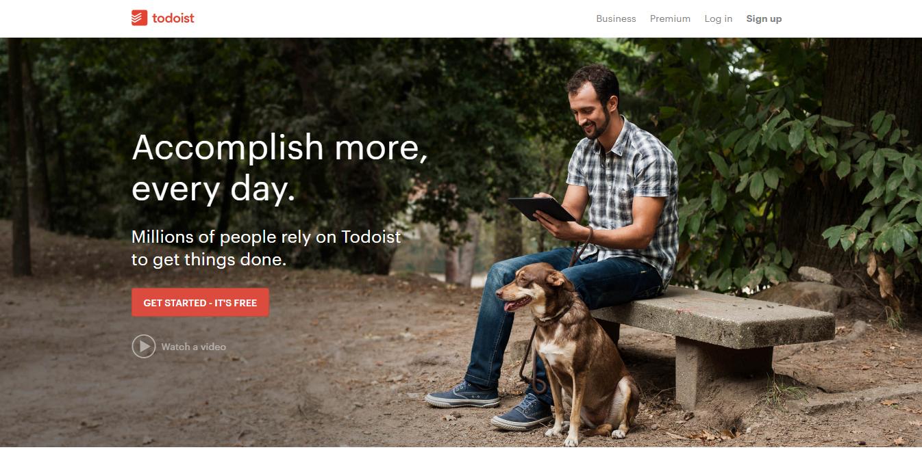Як ви бачите, Todoist використовують білий простір навколо головного тексту, що висвітлює фонове зображення і викликає приємні емоції. Також вони використовують фото веселого хлопця, замість фото самого додатку, що теж є великим плюсом.